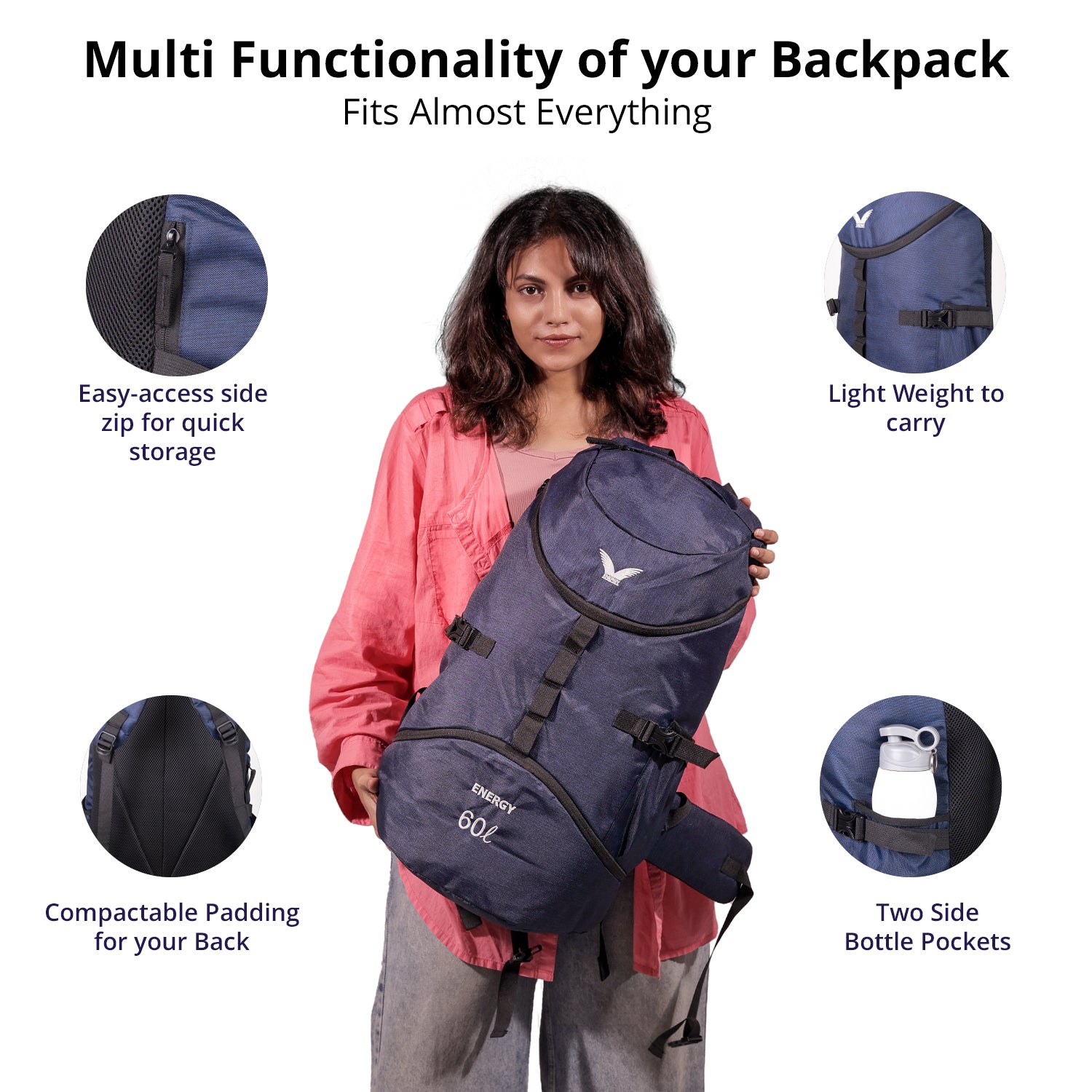 60L Large Capacity: Ample space for trekking, hiking, camping, or extended travel.