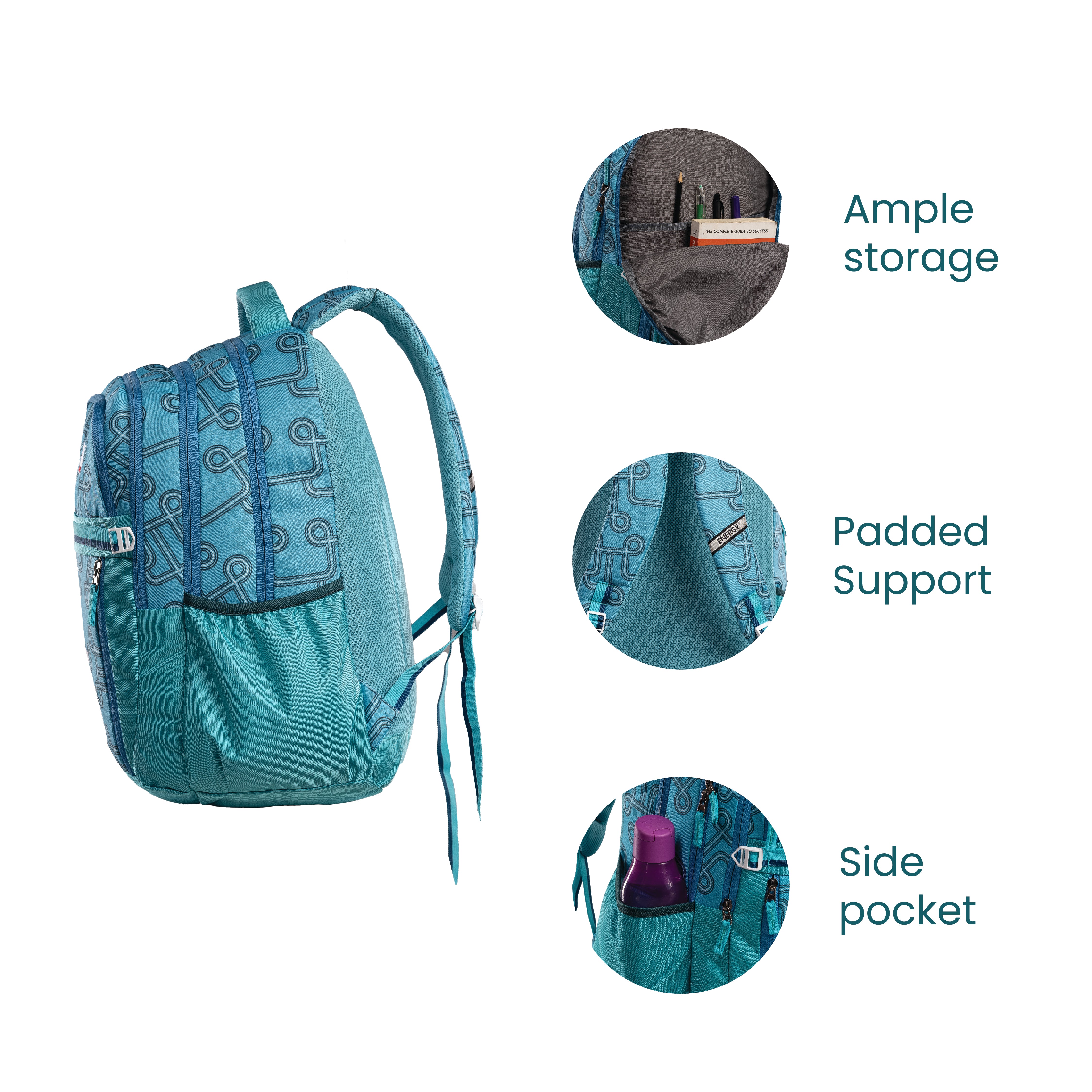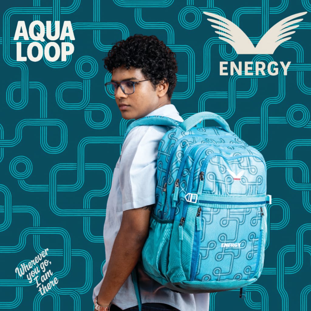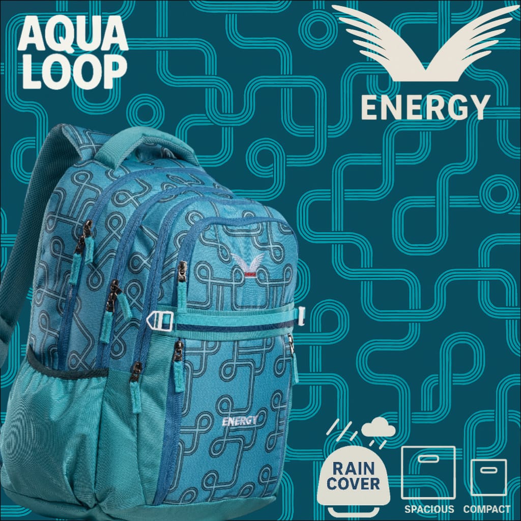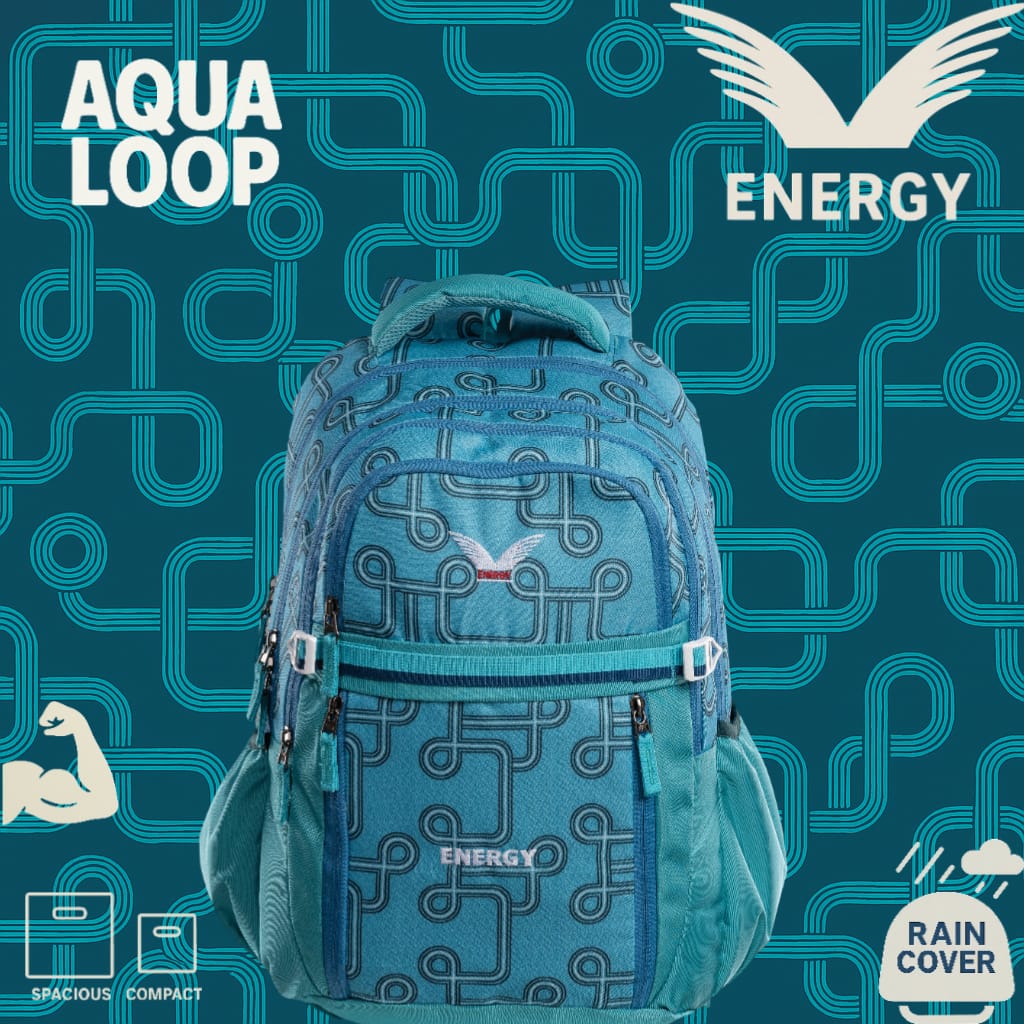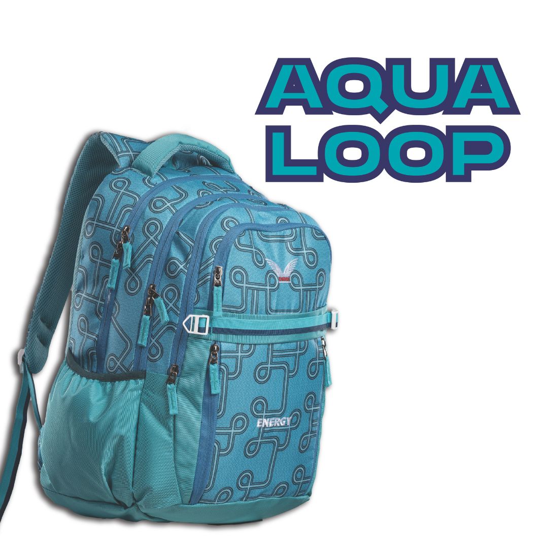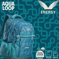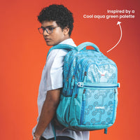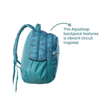 Bold, modern, and built for action — the aqua loop backpack features a vibrant circuit-inspired design with a cool aqua green palette. With ample storage, padded support, and an included rain cover, it's your perfect everyday companion for school, college, or travel.