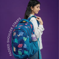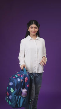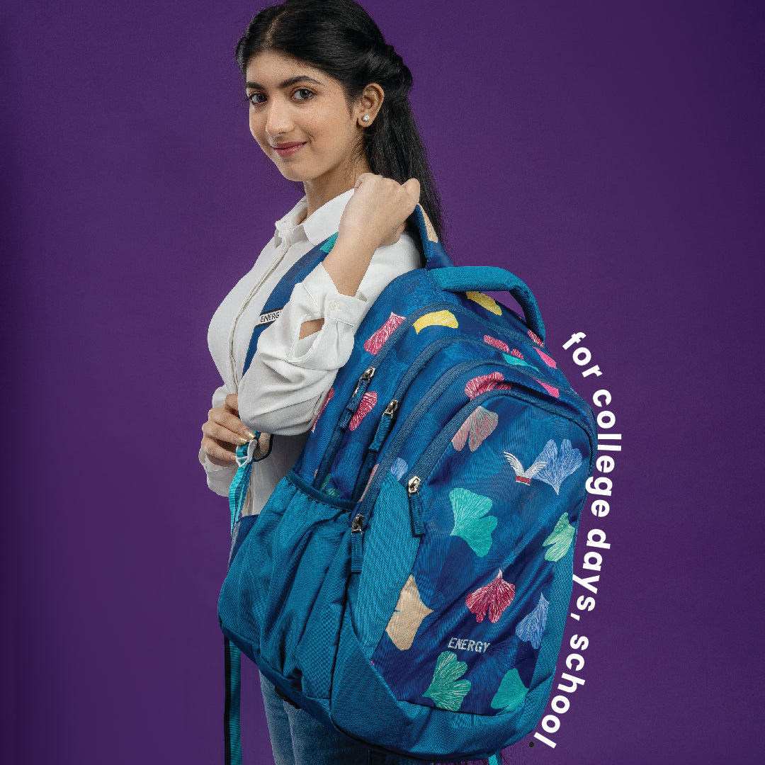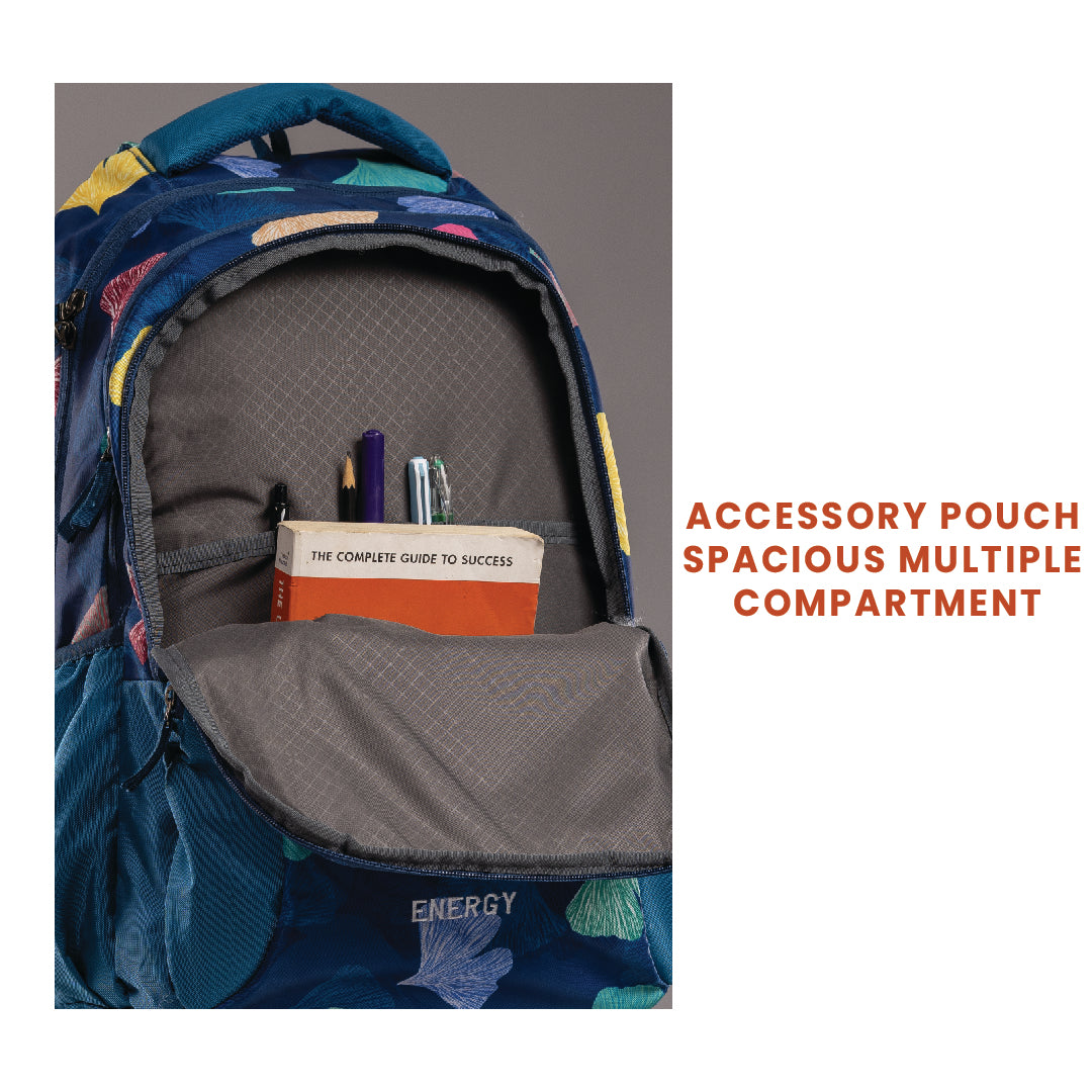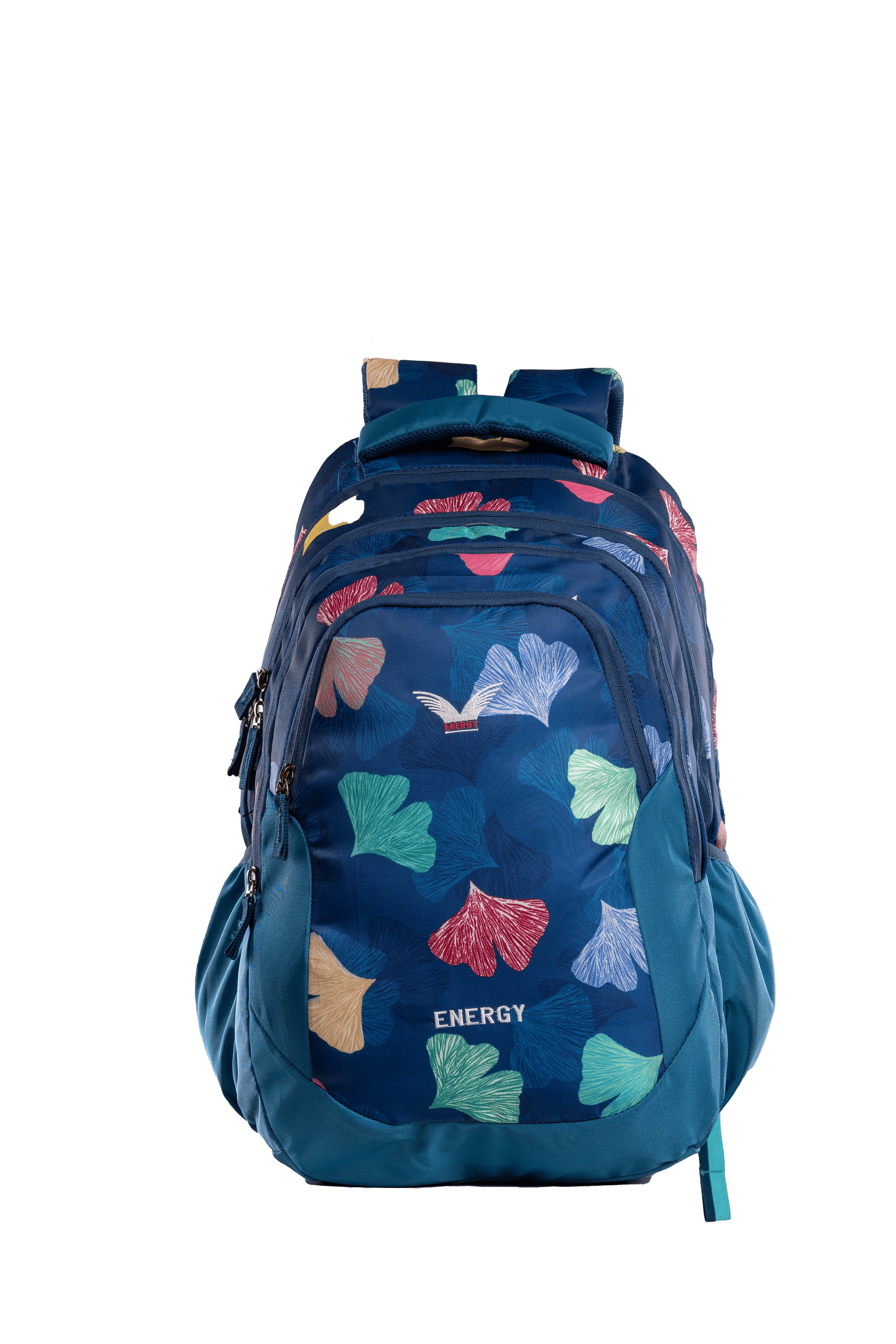 A bold fusion of nature and function, leaf rush brings vibrant leaf patterns to a deep navy base for a refreshing twist. Spacious enough for college days, weekend trips, or school essentials – with a rain cover for all-weather protection.