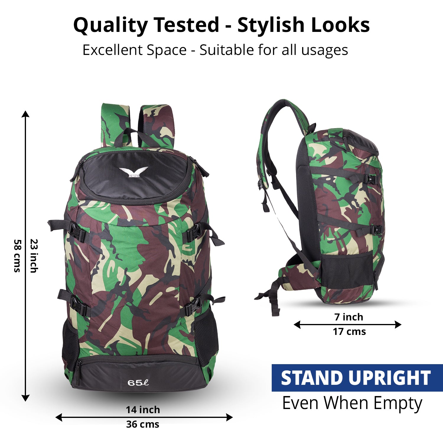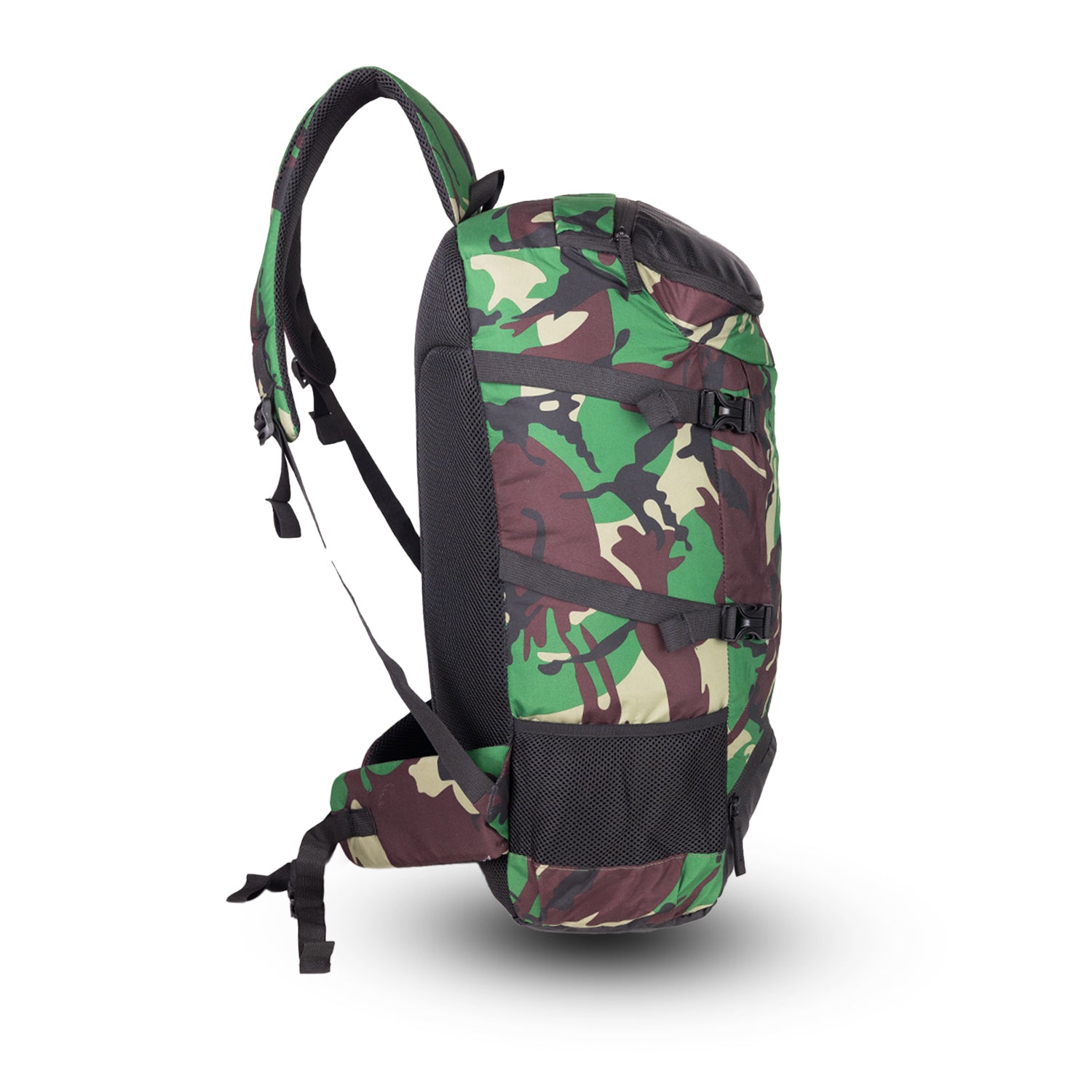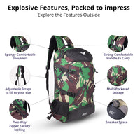 The Terra Quest Backpack – Green Camouflage Edition is engineered for adventurers who need toughness, functionality, and style in one pack. With its green camouflage pattern enhanced by earthy brown, bold black, and beige accents, this 65L backpack brings rugged performance with an outdoor-ready design.