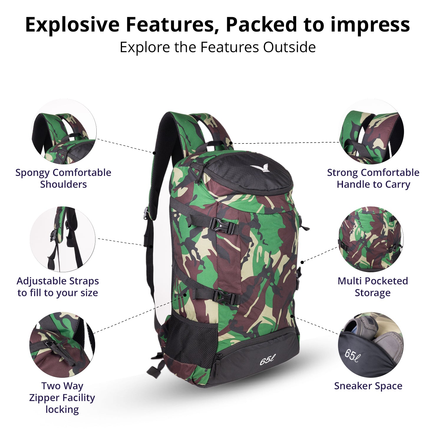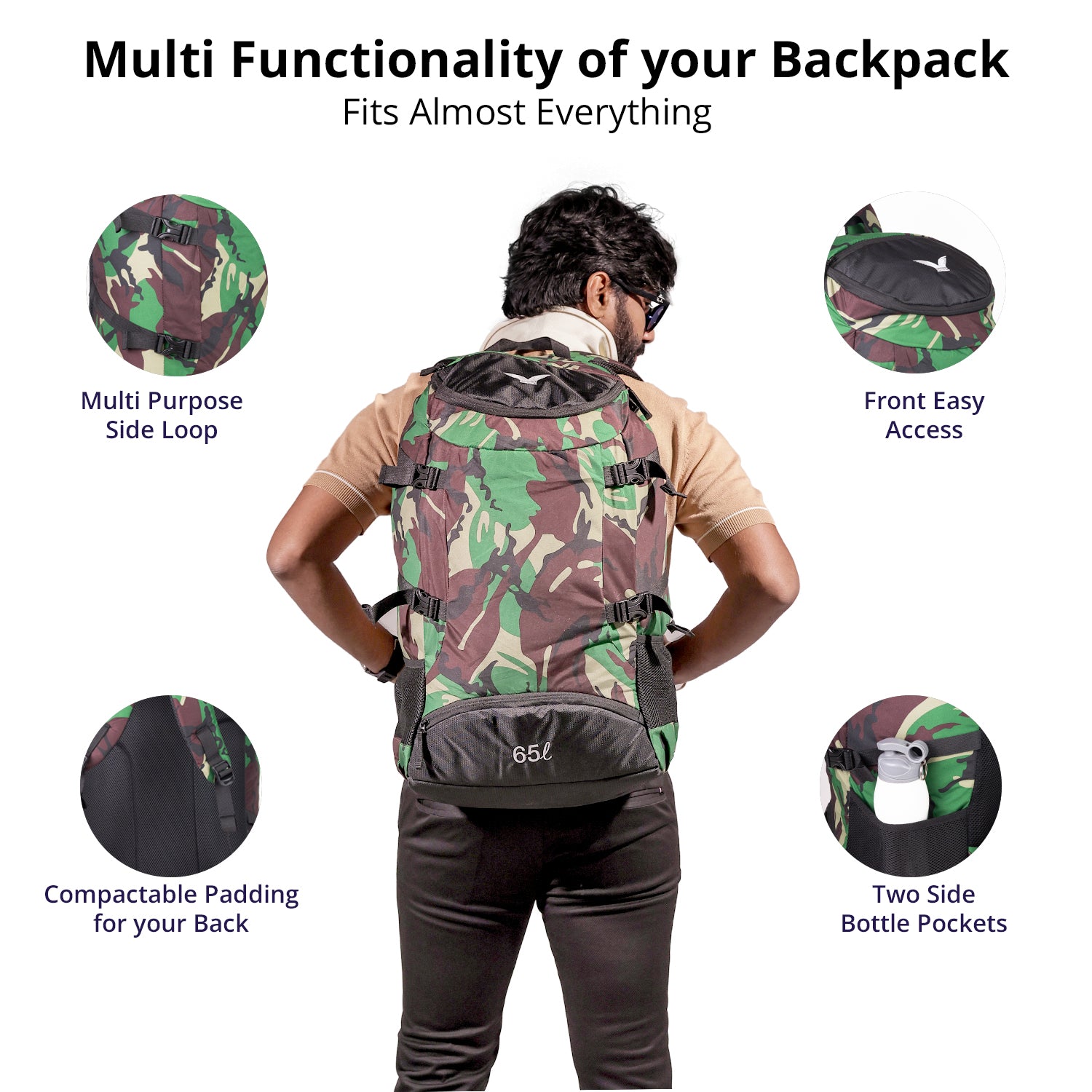 65L Spacious Capacity: Perfect for trekking, hiking, camping, and extended travel.