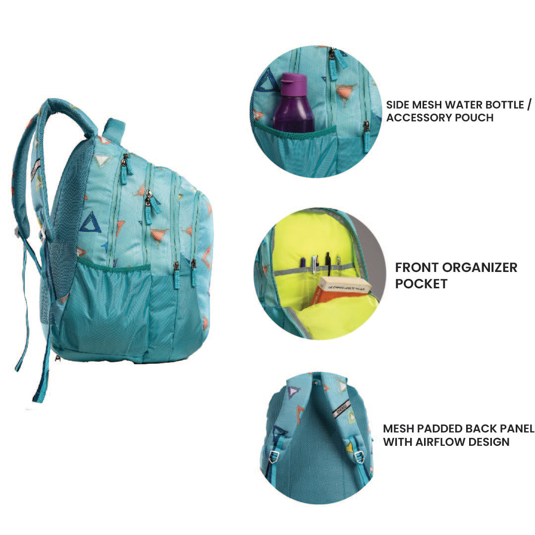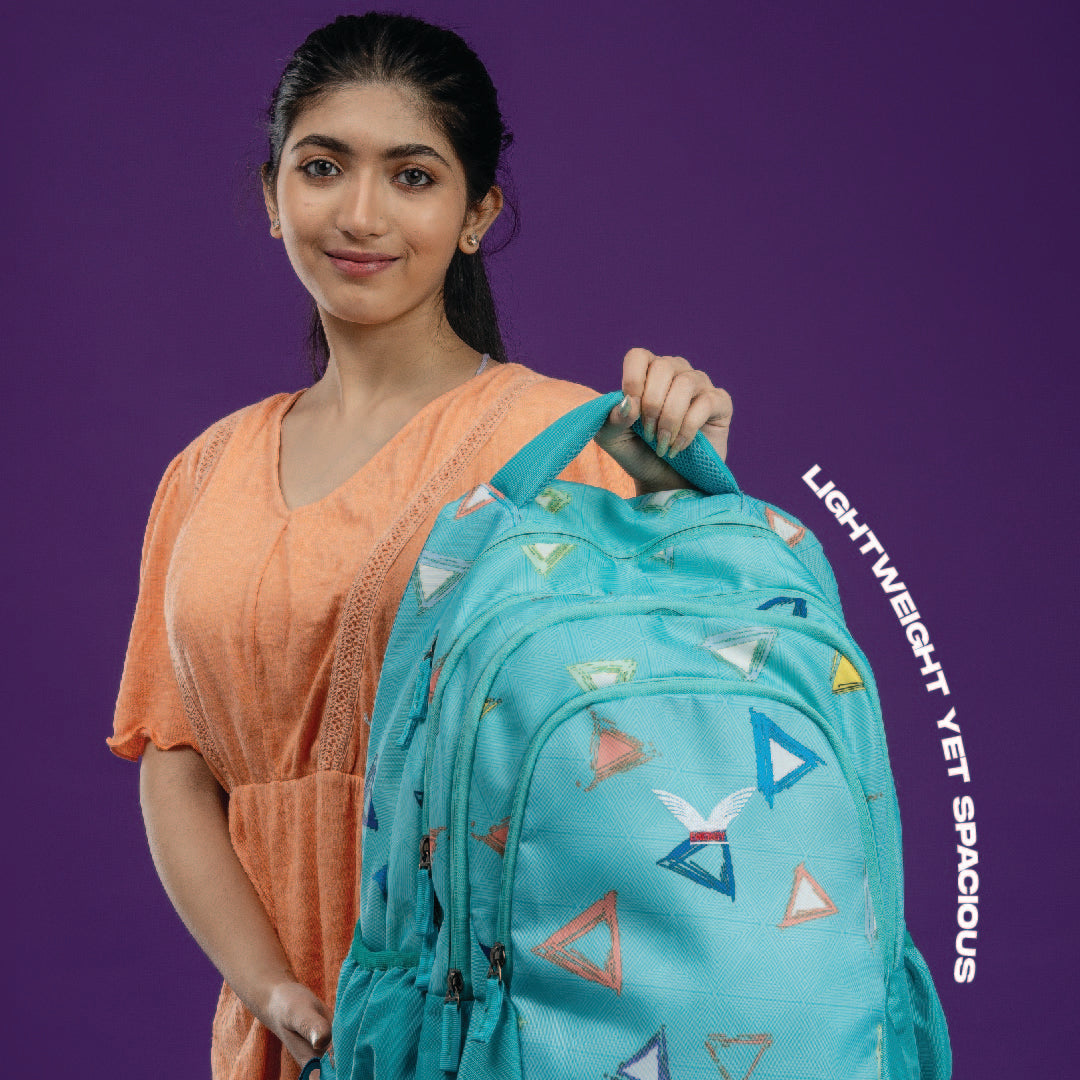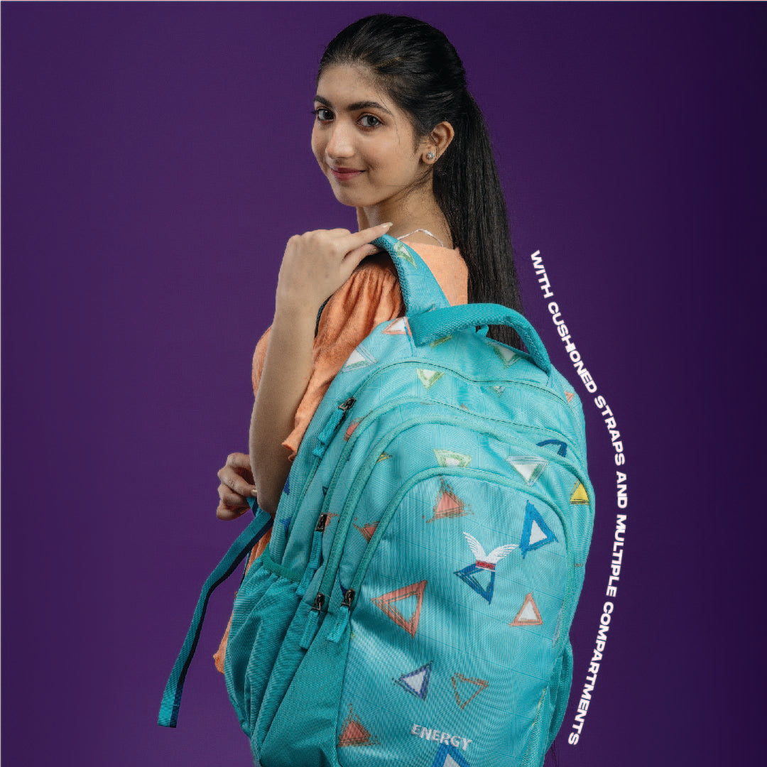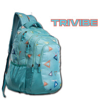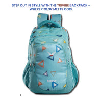 Step out in style with the trivibe backpack – where color meets cool. The dynamic triangle patterns and textured aqua background create a youthful, bold vibe perfect for school, college, or daily adventures. Lightweight yet spacious, this backpack is designed to keep up with your rhythm. With cushioned straps, multiple compartments, and a hidden rain cover, it's function with flair.