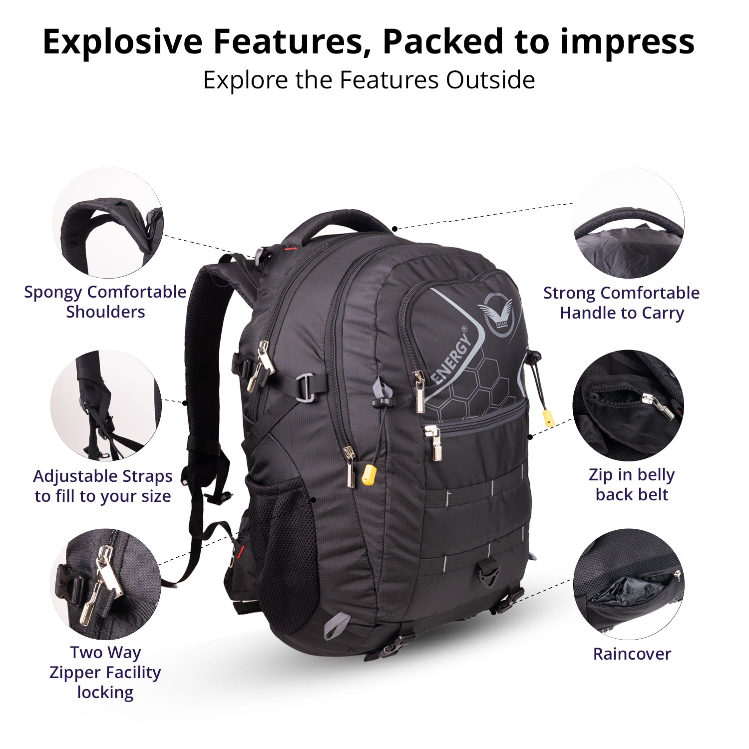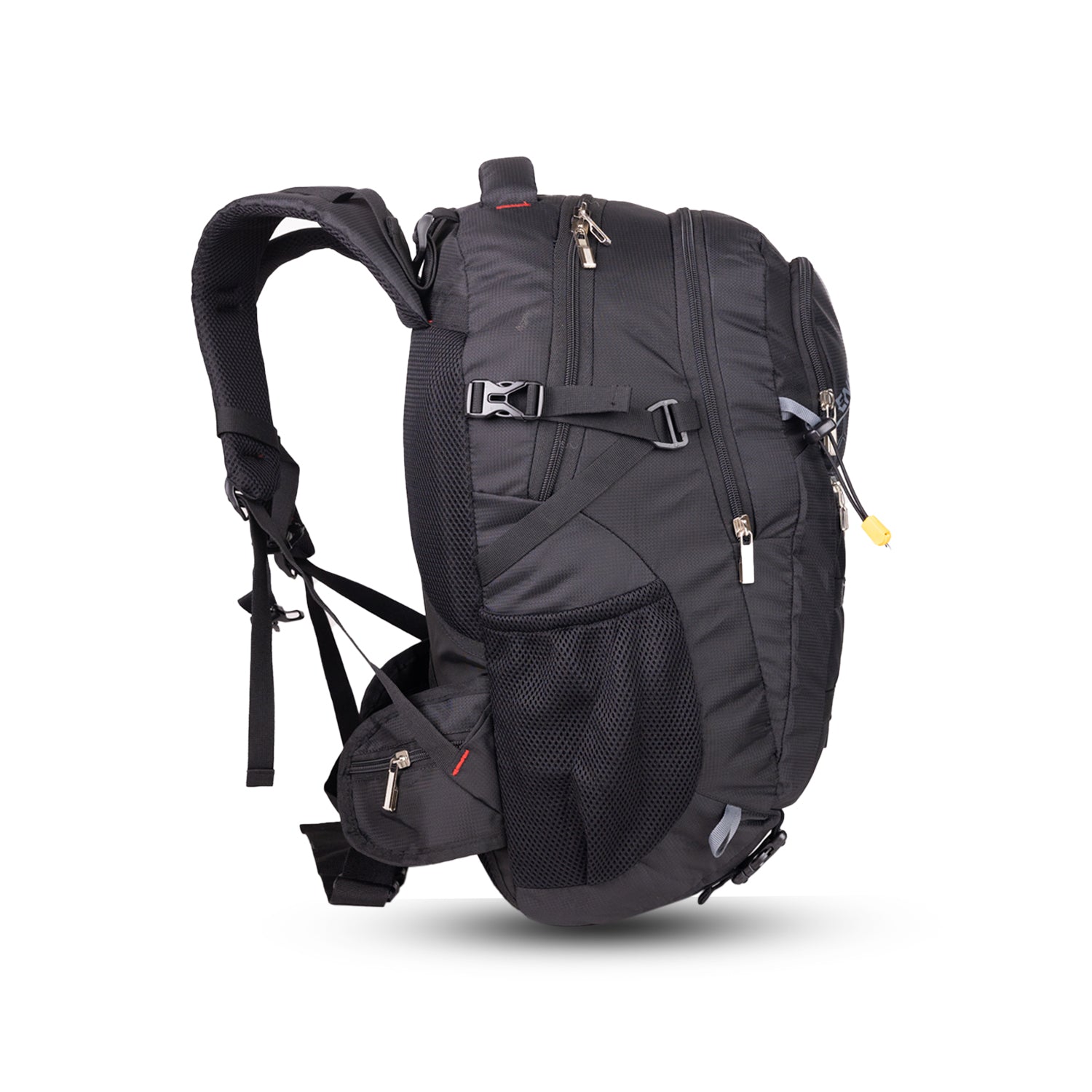Organized Storage: Multiple compartments, mesh side pockets, and compression straps allow easy organization and access.